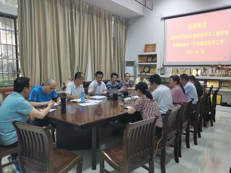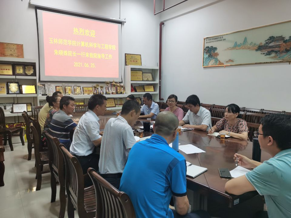 6月25号下午,玉林师范学院计算机科学与工程学院朱晓姝院长一行5人,来我院考察,学院教学工作委员会全体成员在中巴软件大楼104会议室与朱院长一行进行了交流。交流会议上,邵平院长介绍了我院的学科专业基本情况,双方还就今年各自学校的招生情况和申硕情况进行了详细的交流。双方认为,互相之间都是兄弟院校,应该取长补短,保持沟通,尽可能分享好的办学经验,为双方学院在十四五期间取得长足的发展而努力。