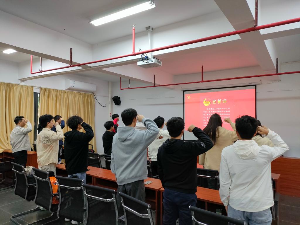 大会第六项:重温入团誓词。团支部书记带领全体成员重温入团誓词,有助于强化团员意识,坚定理想信念,激发团员们的热情和积极性,加强了团支部的向心力与战斗力。