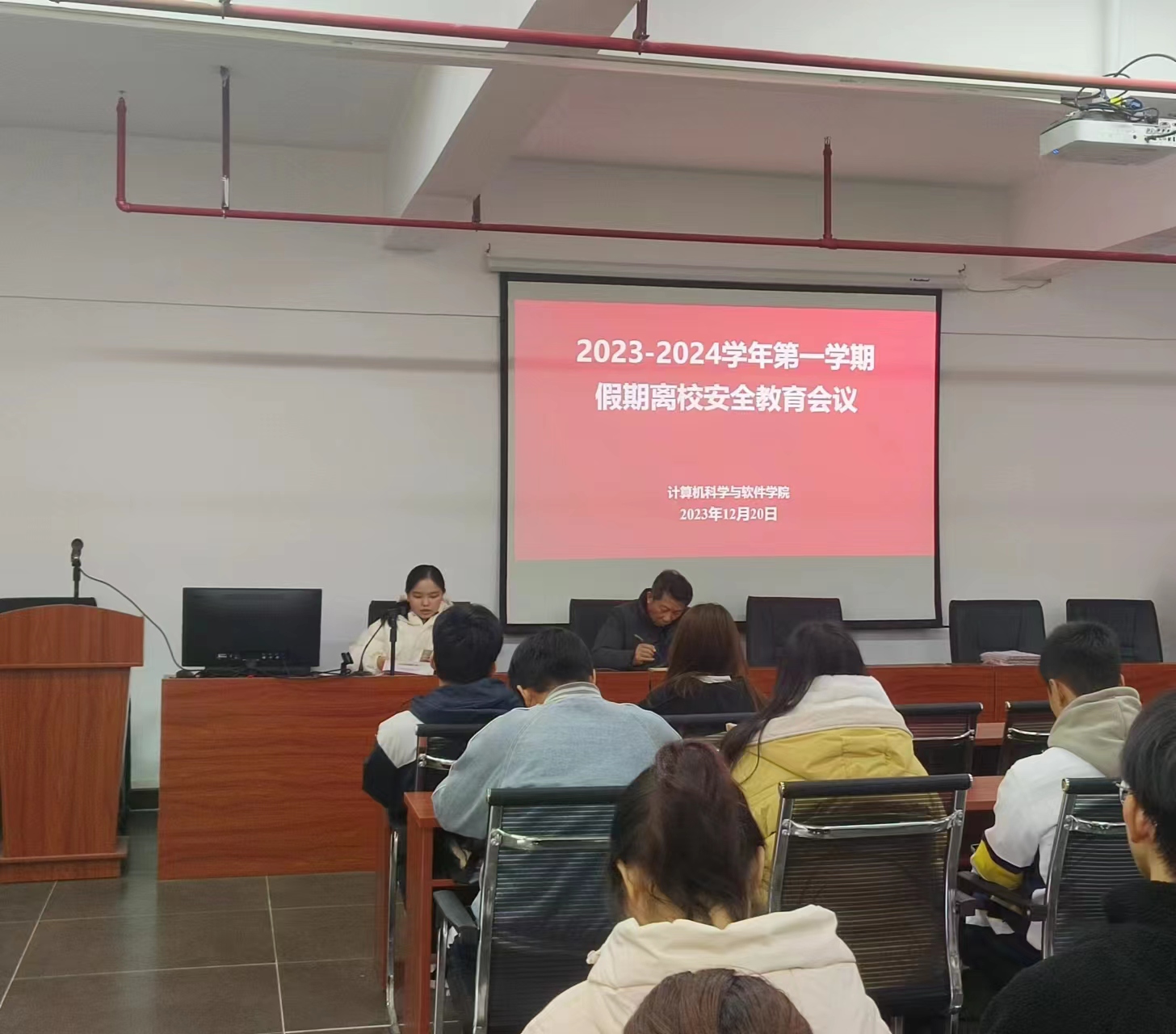 为做好各年级学生文明安全离校工作,营造健康、和谐、文明的离校氛围,2023年12月20日中午,计算机科学与软件学院2023年寒假假期离校安全教育会议在实训315顺利召开。出席本次会议的有副书记陈彦雄、全体辅导员和律委宿管部负责人。