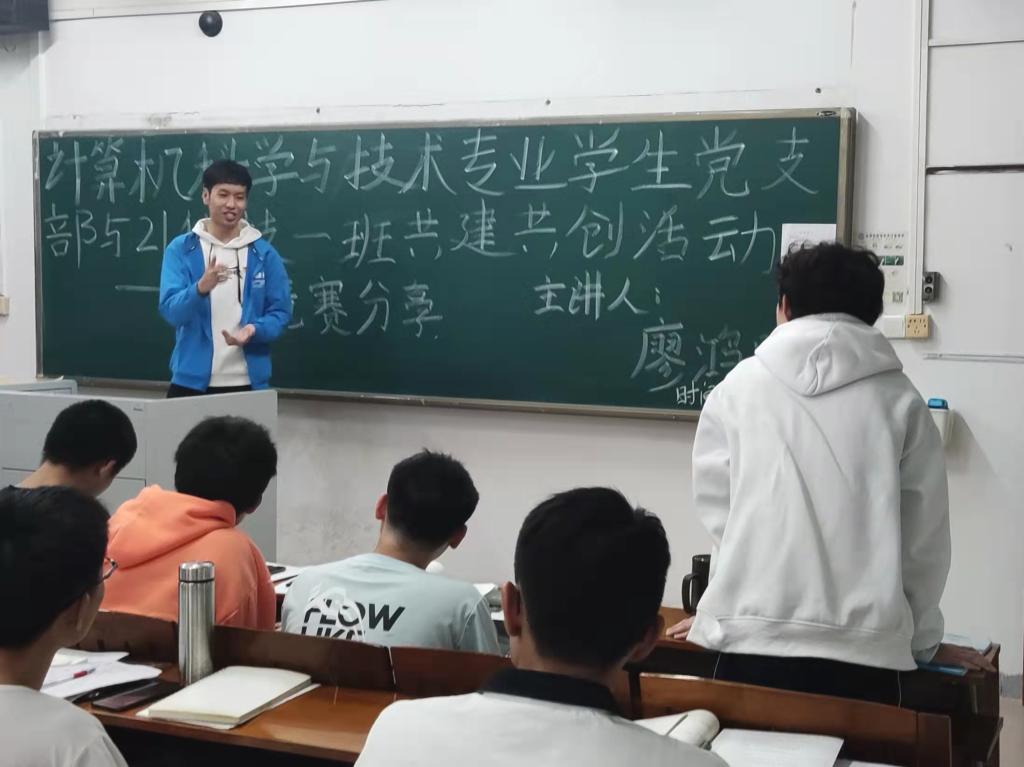 学生党员廖鸿鹏同学从如何了解到这些学科竞赛、如何去准备这些比赛、参加专业竞赛对我专业能力有什么帮助三个问题展开竞赛分享,分享结束后,同学积极发问,如进入大学后发现学习节奏太快,自己无法跟上和关于集训队等问题,廖鸿鹏同学也根据自身经历做出了详细的解答。