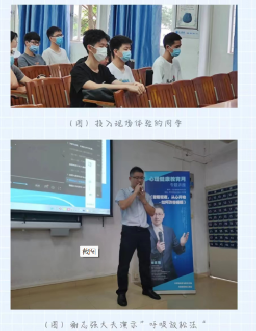 讲座中谢志强大夫用专业的语言详细介绍了睡眠的基本知识,分析了失眠的原因,讲解了生活中对睡眠的误区,传授了睡好觉的秘诀和科学睡眠的方法,并现场指导同学们体验、学习了呼吸放松法、肌肉放松放松、冥想放松法3钟常用的放松方法。通过谢大夫细致认真的讲解,现场同学热情极高,积极配合,在互动环节中,有同学提出:“考前焦虑时怎样调整状态?”及“班级心理委员该如何更好为同学们服务?”等问题,谢大夫也进行了详细的回应,解答了同学们的很多疑惑。