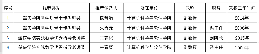 本次评选工作坚持公平、公正、公开的原则,经教师个人申报、学院评审推荐、综合评议,并报请学院党政联席会议审议通过,现将我院拟向教务部推荐的肇庆学院“教学名师奖”等奖项候选人名单公示如下: