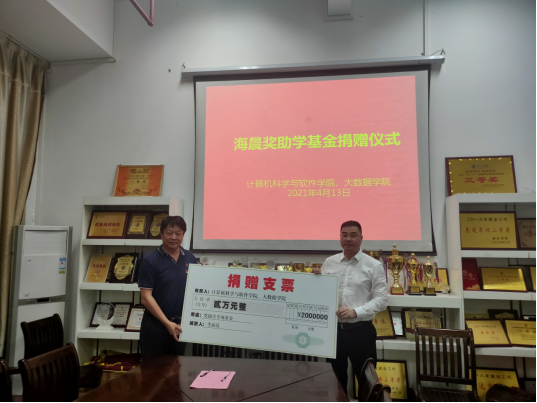 4月13日,我院举行了海晨奖助学基金捐赠仪式。李海晨是我院96届计算机应用专业校友,现任职广东金桥百信(肇庆)律师事务所。毕业以来,一直与学院保持密切联系,也关注学校和学院的发展。每每与他谈起学校和学院的发展时深感自豪,同时也十分关注学院学生的学习生活。经与学院班子交谈后,同意以个人捐资方式设立专项奖助学基金,捐资人民币10万元,分为5年实施,每年捐资2万元。该奖助学金主要是鼓励学习成绩优秀的学生和家庭经济困难学生,直面困难、奋发向上、刻苦学习、自强成才,健康成长。出席本次捐赠仪式的有我院党委书记李坚、院长邵平、副院长王俊波、党委副书记陈彦雄和辅导员老师。